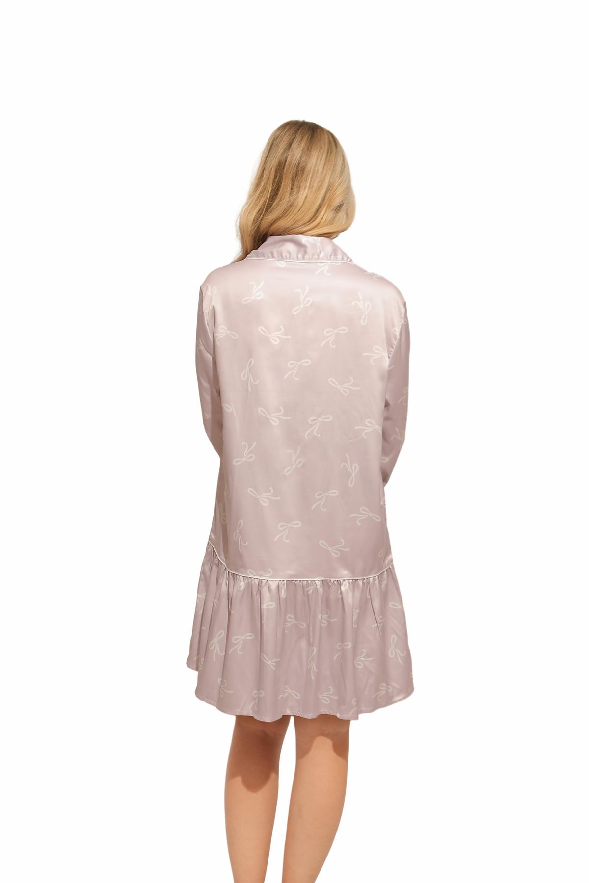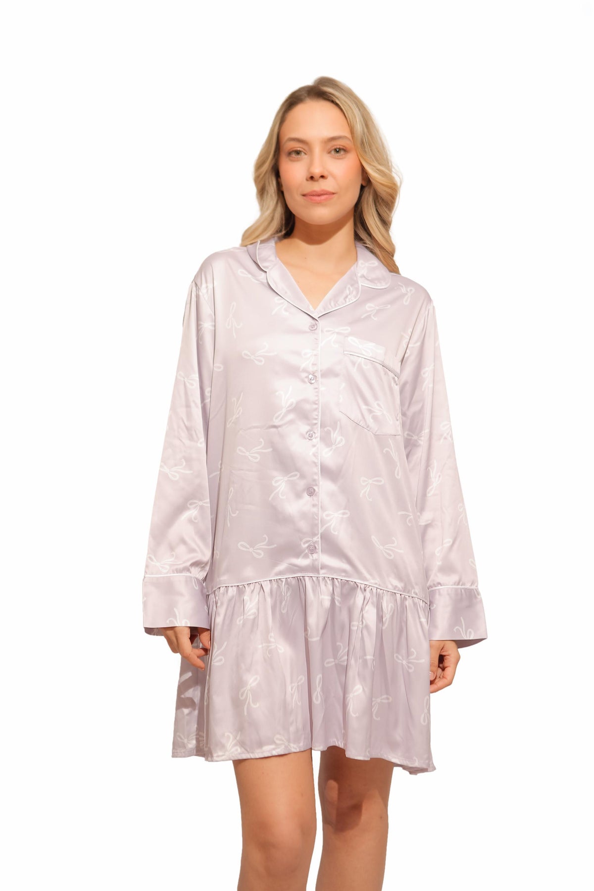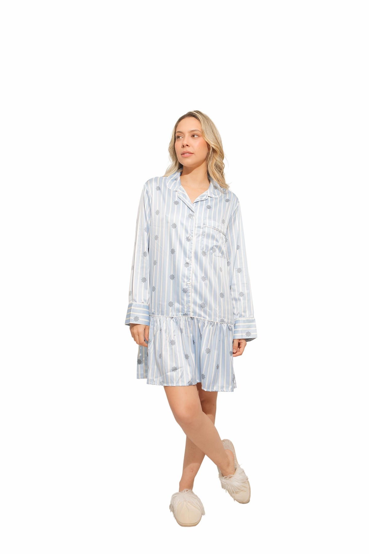 Vestido camisero con caída fluida y detalle de arandela inferior que aporta movimiento y un toque femenino. Su silueta ligera y elegante lo hace ideal para relajarse o para un look cómodo en casa.