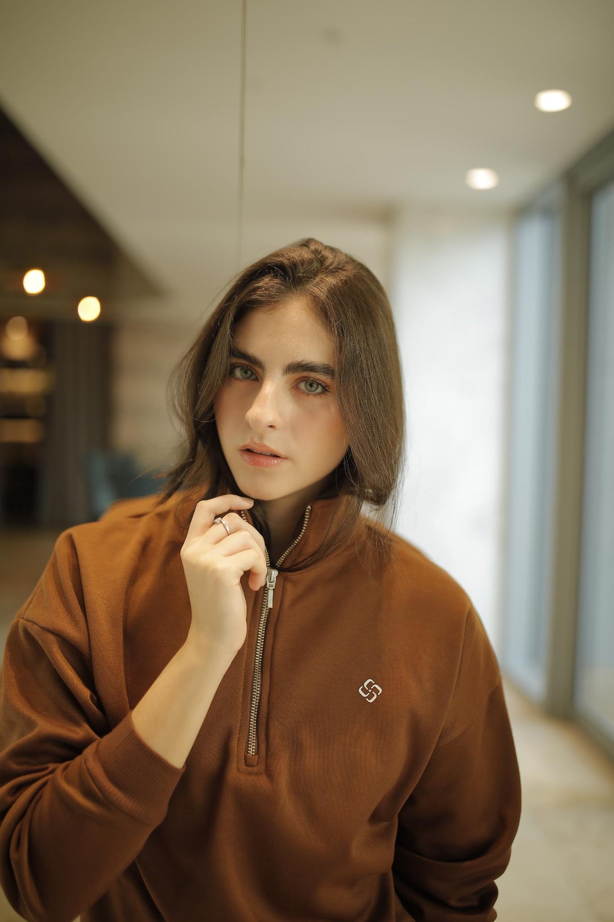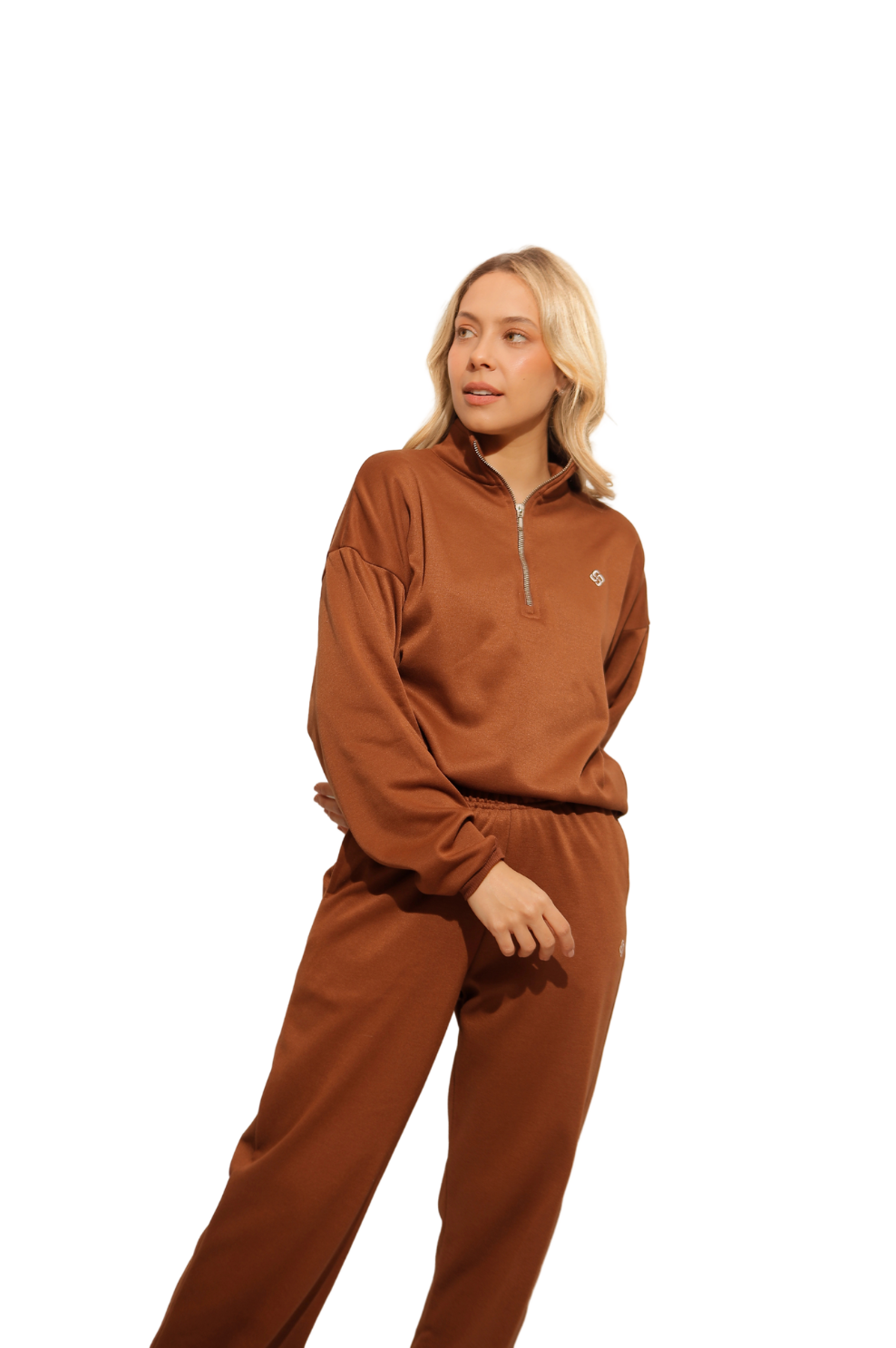 Set en tejido perchado con suéter de cuello alto, zipper metalizado en frente. Pantalón con bolsillos laterales y cintura elástica que mantiene la comodidad en todas tus actividades. Su interior suave y su silueta relajada brindan una sensación cálida y acogedora, ideal para elevar la comodidad en tu rutina diaria. Perfecto para un look cozy, para viajar o para salir con un estilo relajado y moderno.