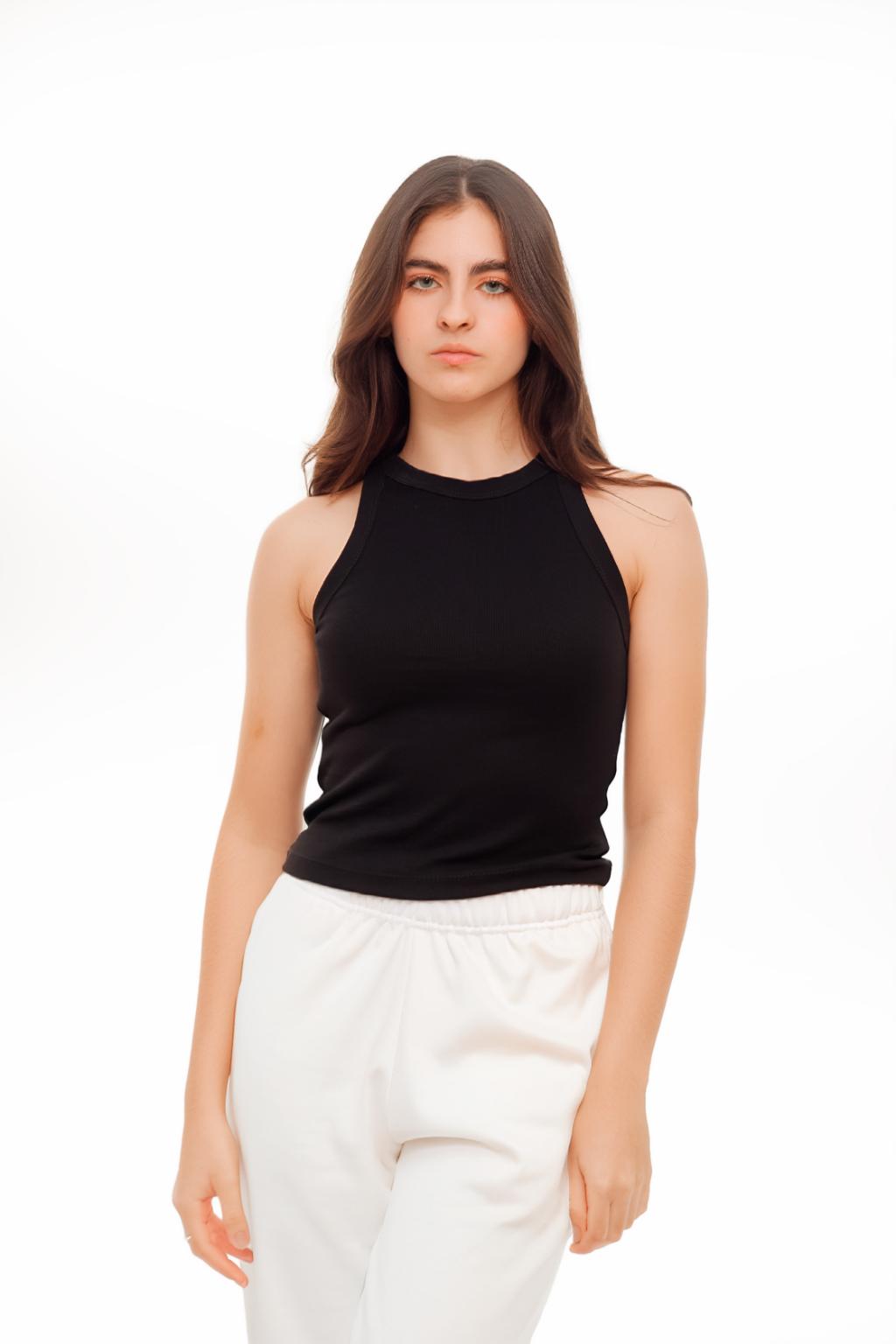 Tank top en rib elástico de tacto suave, con silueta ajustada que acompaña el cuerpo sin perder comodidad. Perfecto para usar solo o como capa base.